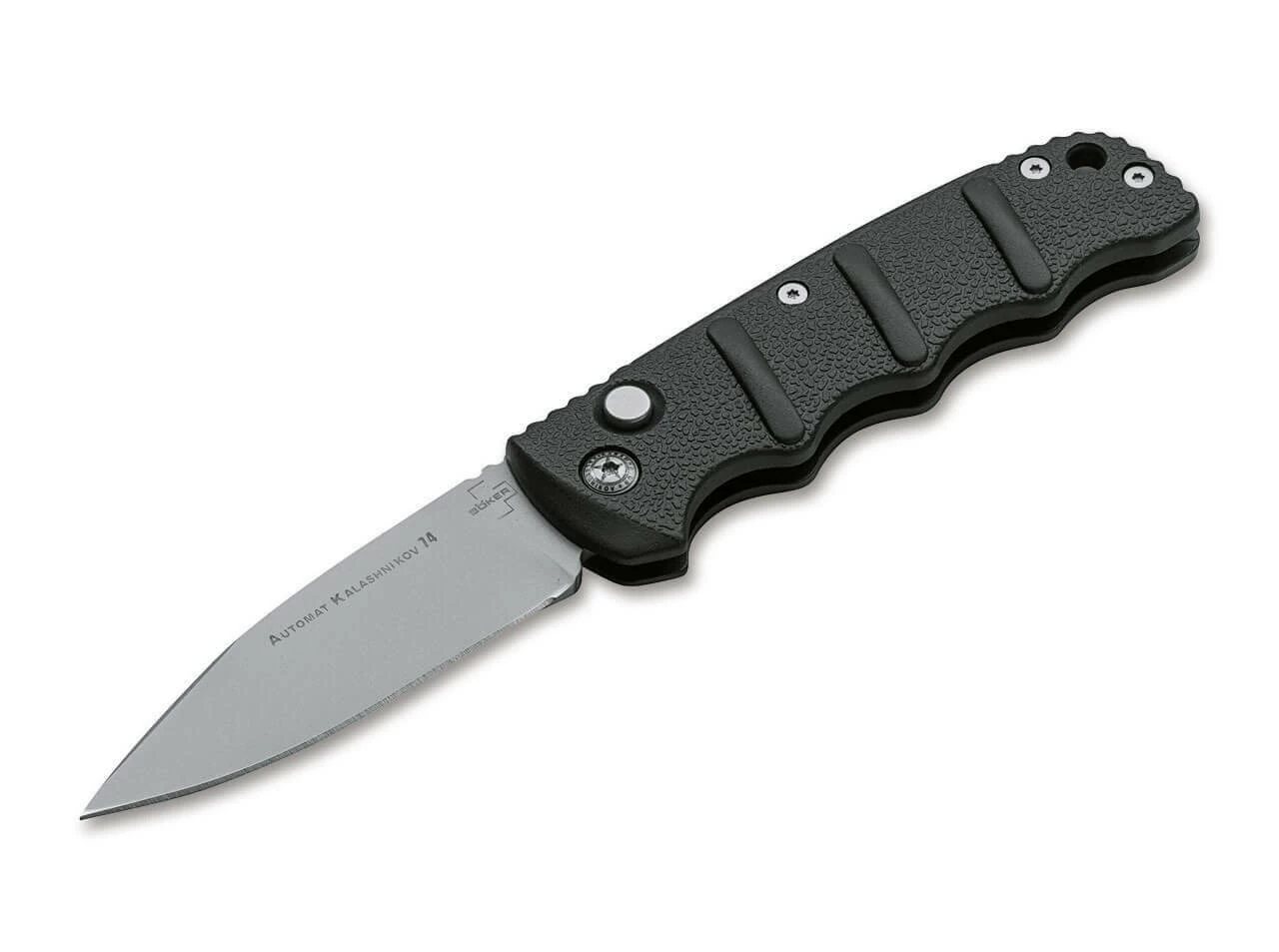 Das Böker Plus AKS-74 aus der Kalashnikov-Serie gehört mit Sicherheit zu den beliebtesten Modellen unseres Sortiments und wurde in den vergangenen Jahren in zahlreichen verschiedenen Varianten produziert. Der schwarze Griff aus Aluminium erinnert stark an das Bajonett des berühmten Sturmgewehrs, die erhabenen Strukturbahnen bieten zudem in jeder Situation sicheren Halt. Die gestrahlte Klinge wird aus rostfreiem D2 gefertigt und kann zusätzlich zum Druckknopf per Schiebesicherung gesichert werden. Mit Fangriemenöse und praktischem Clip (Tip-Up/r).