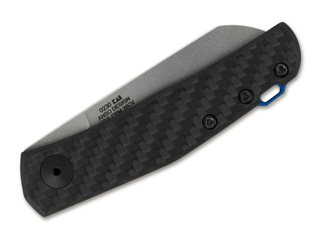 Dass Slipjoint-Messer nicht zum alten Eisen zählen, beweist Jens Anso mit dem Zero Tolerance Anso 230 Black. Die Sheepfoot Klinge aus pulvermetallurgischem CPM-20CV ist mit einem rustikalen Stonewash Finish versehen, während der Griff aus Kohlefaser ein modernes Ambiente schafft. Selbstverständlich darf auch hier der klassische Nagelhau nicht fehlen. Die blau eloxierte Fangriemenöse ist ein gekonnter Blickfang und lässt die Handschrift des dänischen Messerdesigners erkennen.