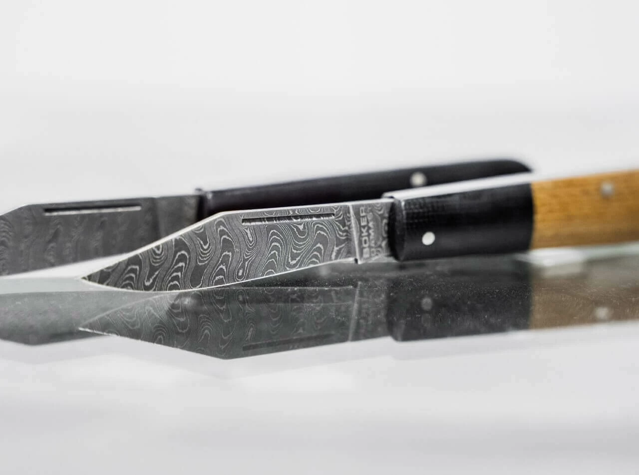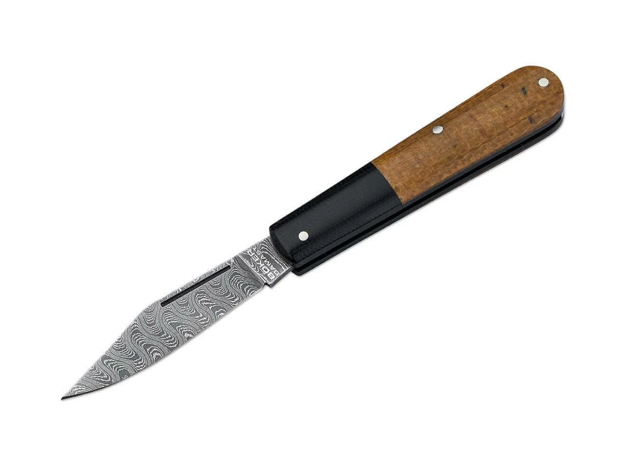 Das klassische Barlow erhält in dieser besonderen Ausführung eine edle Klinge aus 200-lagigem Damast im Muster Riple und fein abgestimmte Griffbeschalung aus schwarzem- sowie braunem Micarta. Mit seiner charakteristischen, überlangen Backe und der breiteren Klinge ist das Slipjoint-Messer einerseits ein kleiner, absolut hosentaschentauglicher Begleiter, andererseits aber auch groß genug, um die meisten Schneidarbeiten des Alltages problemlos zu bewältigen. Die Auslieferung erfolgt in einem hochwertigen Filz-Etui zur Aufbewahrung. Handgefertigt in der Böker Manufaktur in Solingen.