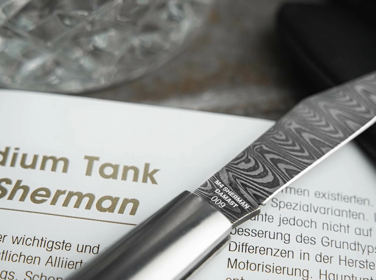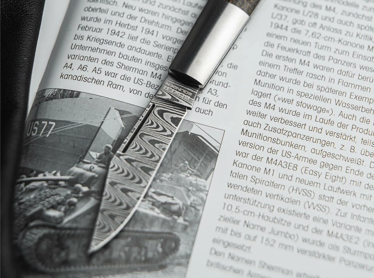 Das Böker Barlow M4 Sherman-Damast ist mit einer einzigartigen Damastklinge ausgestattet, die aus verschiedenen Materialien aus der Produktion von M4 Sherman-Panzern geschmiedet wird, die zuvor vom Museum restauriert wurden. Der einzigartige Damast aus 80 Lagen wird für uns von Hand von Chad Nichols im Muster Customized Ladder geschmiedet und erinnert an die Panzerspuren, die von den schweren Ketten des M4 Sherman im Boden zurückbleiben. Das in Integralbauweise ausgeführte Barlow ist mit Griffschalen aus Jute Micarta versehen, die farblich an die authentische Tarnlackierung der U.S. Army und dem Marine Corps erinnern. Die aus dem Vollen CNC-gefrästen Hefte aus rostfreiem Stahl bilden gleichzeitig die charakteristischen Backen und werden von Hand matt geschliffen. Mit hochwertigem Filz-Etui zur Aufbewahrung, Echtheitszertifikat und individueller Seriennummer. Handgefertigt in der Böker Messer-Manufaktur Solingen.