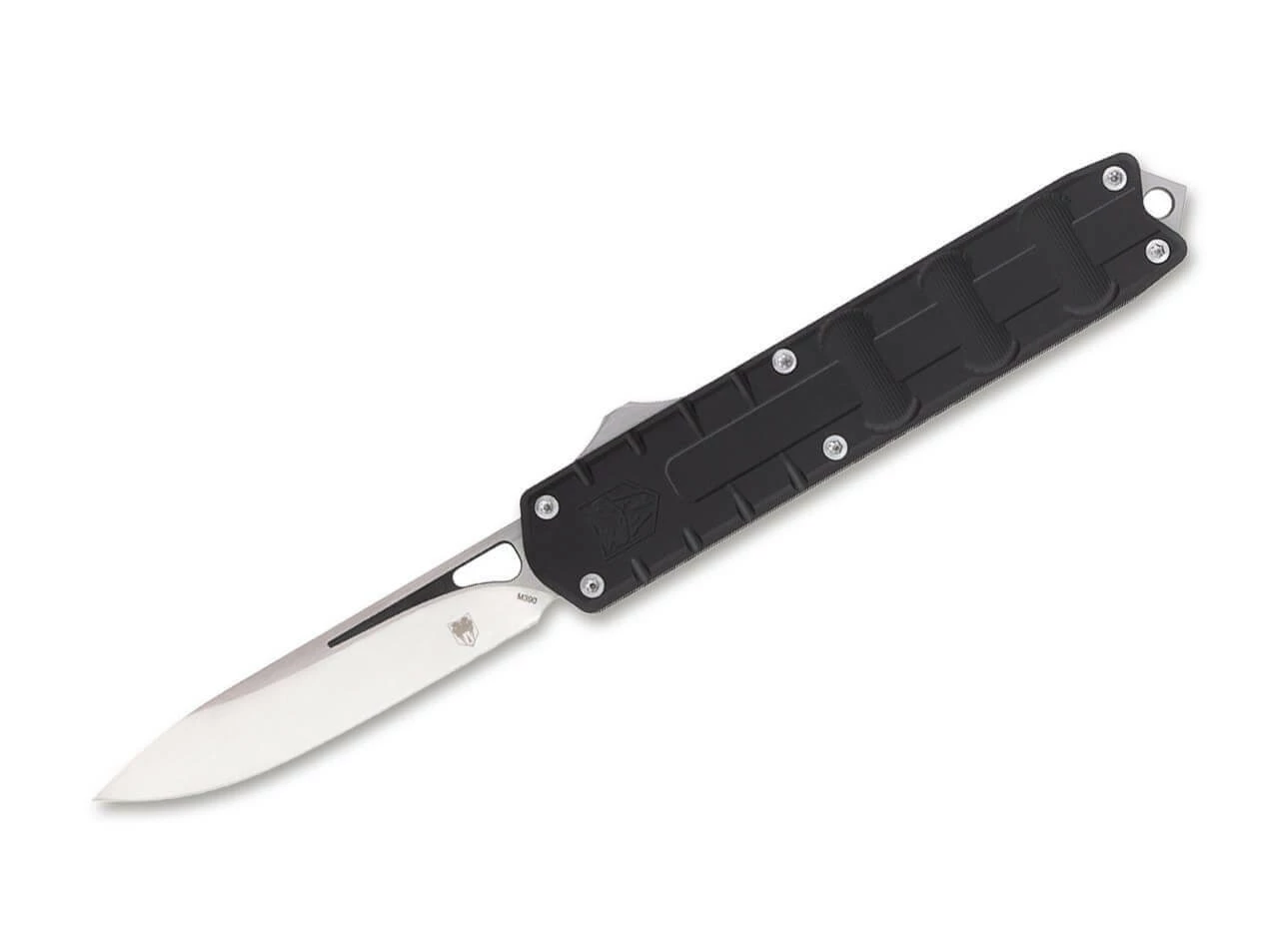 Der ausgewachsene Black Enforcer überzeugt mit einer unverwüstlichen Drop Point Klinge aus M390, die pfeilschnell per Knopfdruck aus dem vorderen Griffstück kommt und bei erneutem Betätigen wieder dort verschwindet. Das OTF Messer (Out The Front) ist mit einem texturierten Griff aus hochfestem Aluminium versehen, der in einem taktischen Schwarz gehalten ist. Im Glasbrecher ist eine Fangriemenöse zum Transport integriert.