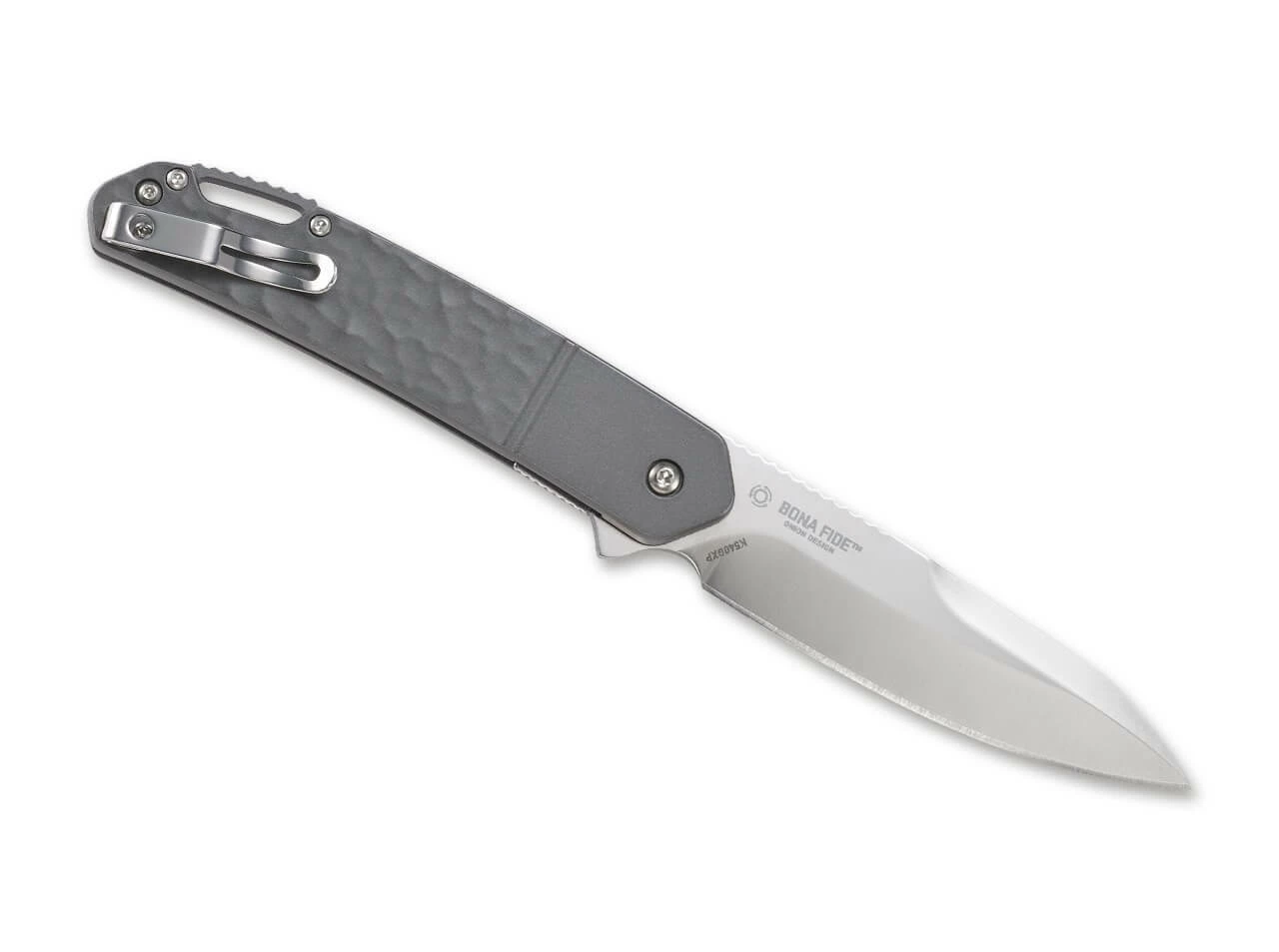 Dieser elegante Linerlock Folder von Ken Onion macht seinem Namen Bona Fide alle Ehre (lat. Guter Glauben) und überzeugt mit einer überragenden Zuverlässigkeit. Das Messer lässt sich durch die Field Strip Technologie ohne Werkzeug zerlegen und reinigen. Die kugelgelagerte Klinge aus hochfestem D2 öffnet per Flipper. Der graue Griff aus Aluminium ist texturiert und liegt bei den anfallenden Arbeiten sicher in der Hand. Mit Clip (Tip-up/r) und Fangriemenöse.