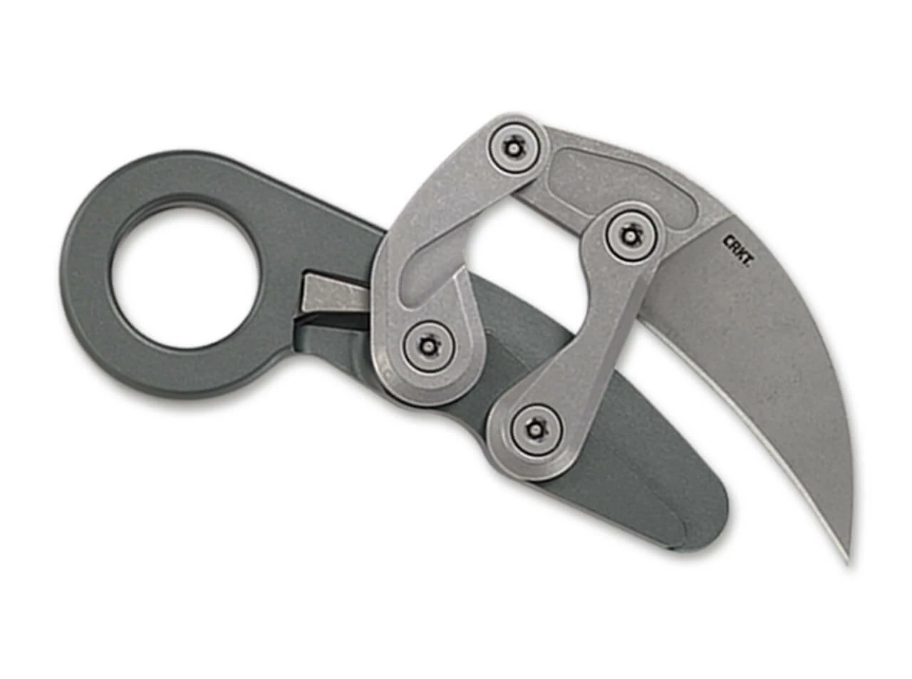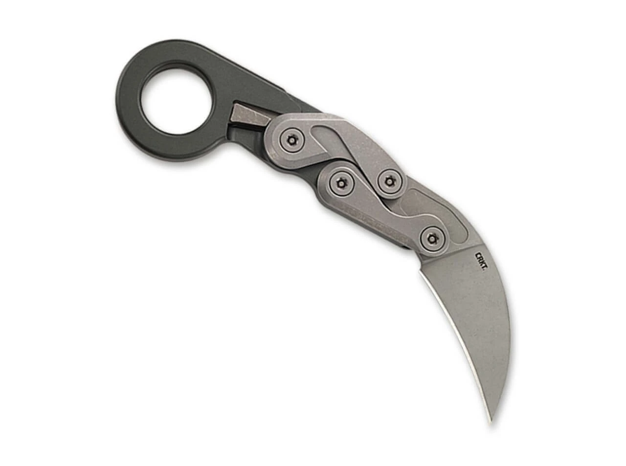 Die kompakte Variante des beliebten CRKT Provoke überzeugt mit der bekannten Kombination aus Hawkbill-Klinge, Aluminiumgriff und dem legendären Kinematic-Mechanismus zum Öffnen und Schließen des Messers. Die auf zwei beweglichen Armen gelagerte Klinge aus D2 dreht sich nicht klassisch um eine Achse, sondern wird vom Griff parallel nach vorne herausgeschwenkt und verriegelt. Die Verriegelung des Kerambits wird mit dem in Griff eingelassenen Hebel wieder gelöst. Die Bedienung ist so unkompliziert und intuitiv, dass stets ein sicheres und schnelles Handling gewährleistet ist. Das geringe Gewicht macht den außergewöhnlichen Folder von Joe Caswell zudem besonders alltagstauglich. Mit Clip (Tip-up/l).