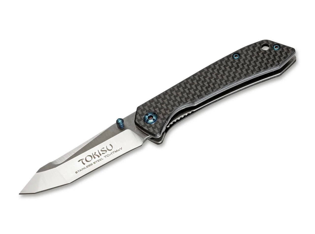 Das 18451 von Tokisu ist ein kompaktes Taschenmesser mit einer aufwendig geschliffenen Tanto-Klinge aus 7Cr17MoV. Der Griff aus laminiertem G10 birgt den Linerlock und ist mit anodisierten blauen Schrauben versehen. Ein einzigartiges Taschenmesser mit faszinierendem Carbon-Look, dass in jeder Hosentasche seinen Platz findet. Mit Daumenpin zum Öffnen der Klinge.