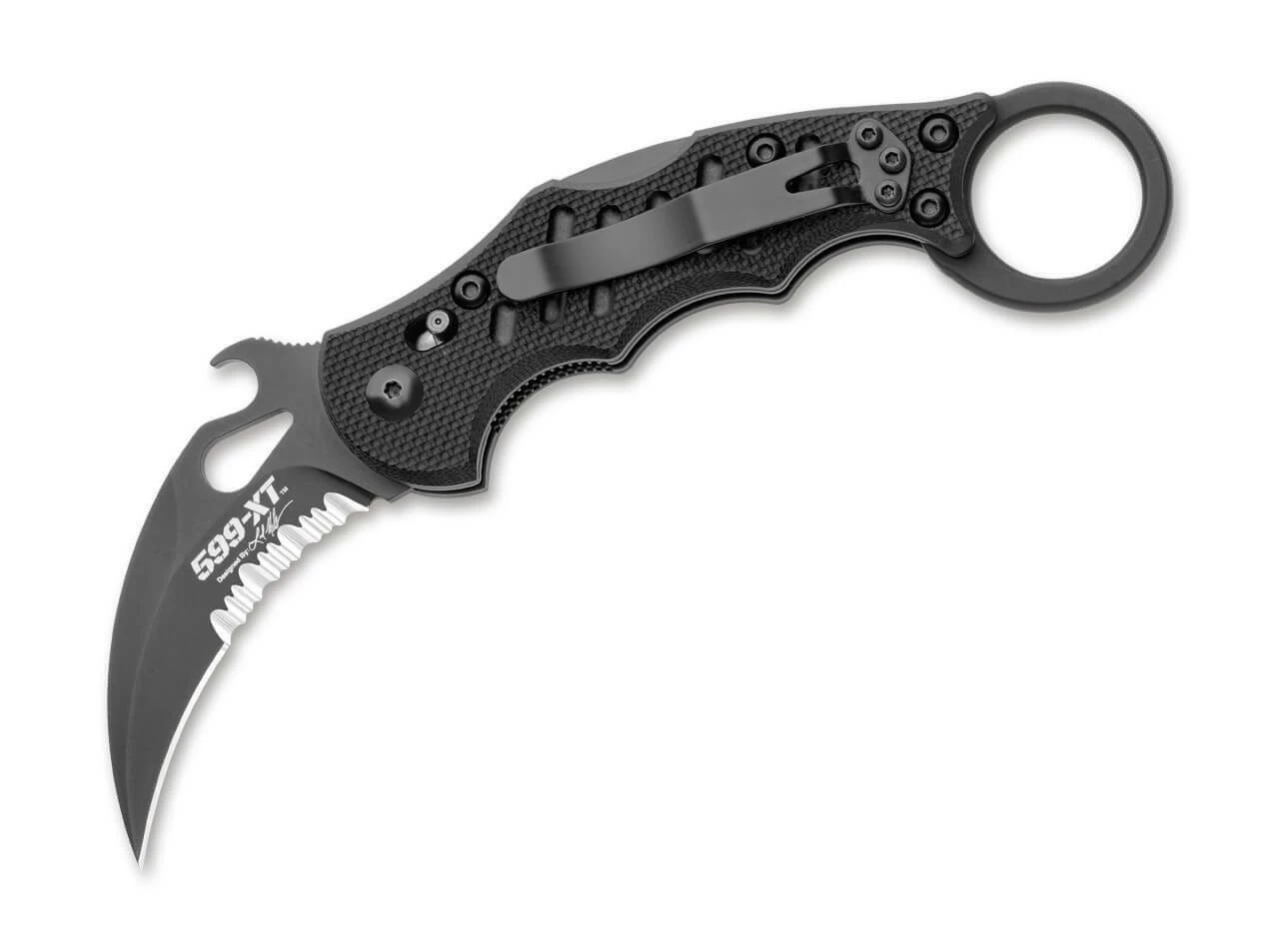 Arbeitsmesser mit Ring am Griffende wurden bereits seit dem 11. Jahrhundert in Südostasien verwendet. Der Ring erlaubt ein freihändiges Arbeiten mit dem Messer, ohne es dabei aus der Hand legen zu müssen und verringert die Verlustgefahr. Die Wellenschliff-Klinge des 599 XTS wird aus N690 gefertigt und ist schwarz beschichtet. Sie wird per Wave-Opener geöffnet und von einem Back Lock arretiert. Eine zusätzliche Verrieglung erhöht zudem die Arbeitssicherheit. Die Griffschalen bestehen aus rutschfestem schwarzen G10. Mit Glasbrecher und umsetzbarem Clip (Tip-up/l-r).