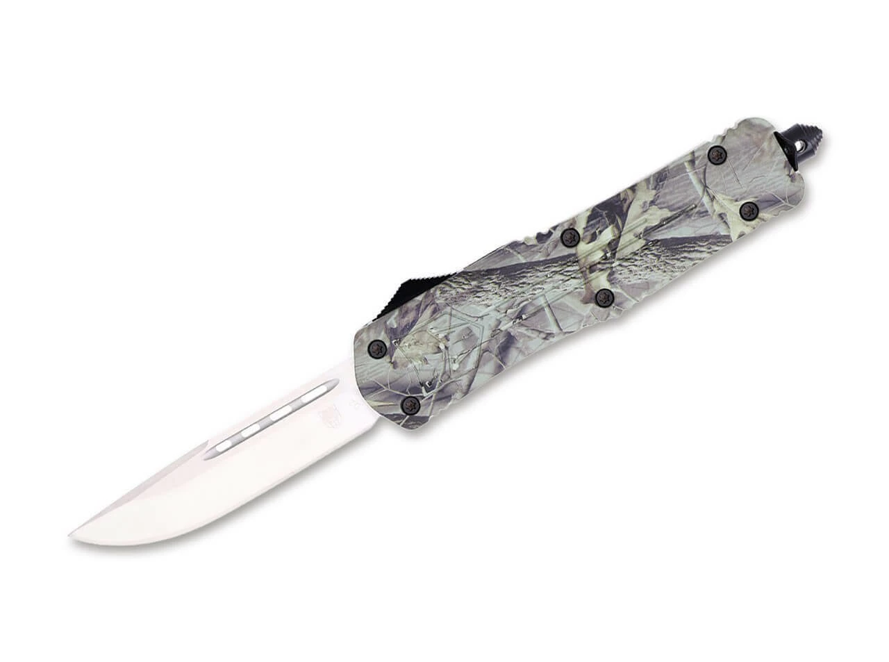 Die ausgewachsene Variante des beliebten FS-3 überzeugt mit einer soliden D2 Drop Point Klinge, die pfeilschnell per Knopfdruck aus dem vorderen Griffstück kommt und bei erneutem Betätigen wieder dort verschwindet. Das OTF Messer (Out The Front) ist mit einem texturierten Griff aus hochfestem Aluminium versehen, der ein waldgrünes Tarnmuster trägt. Der Deep-Carry Clip ist am Glasbrecher befestigt und erlaubt eine beidseitige Tip-Up Trageweise. Lieferung mit hochwertigem Nylon Etui.