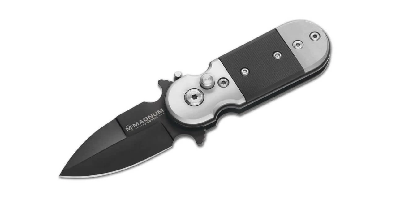 Dieses handliche und klein dimensionierte Springmesser wirkt sehr futuristisch. Der solide verarbeitete Griff besteht aus einer Kombination von gestrahltem Edelstahl und schwarzen G10-Schalen. Die rostfreie 440er Klinge ist geschwärzt und besitzt einen doppelseitigen Handschutz. Eine Sicherung verhindert ein ungewolltes Auslösen der Klinge. Inklusive Taschenclip.