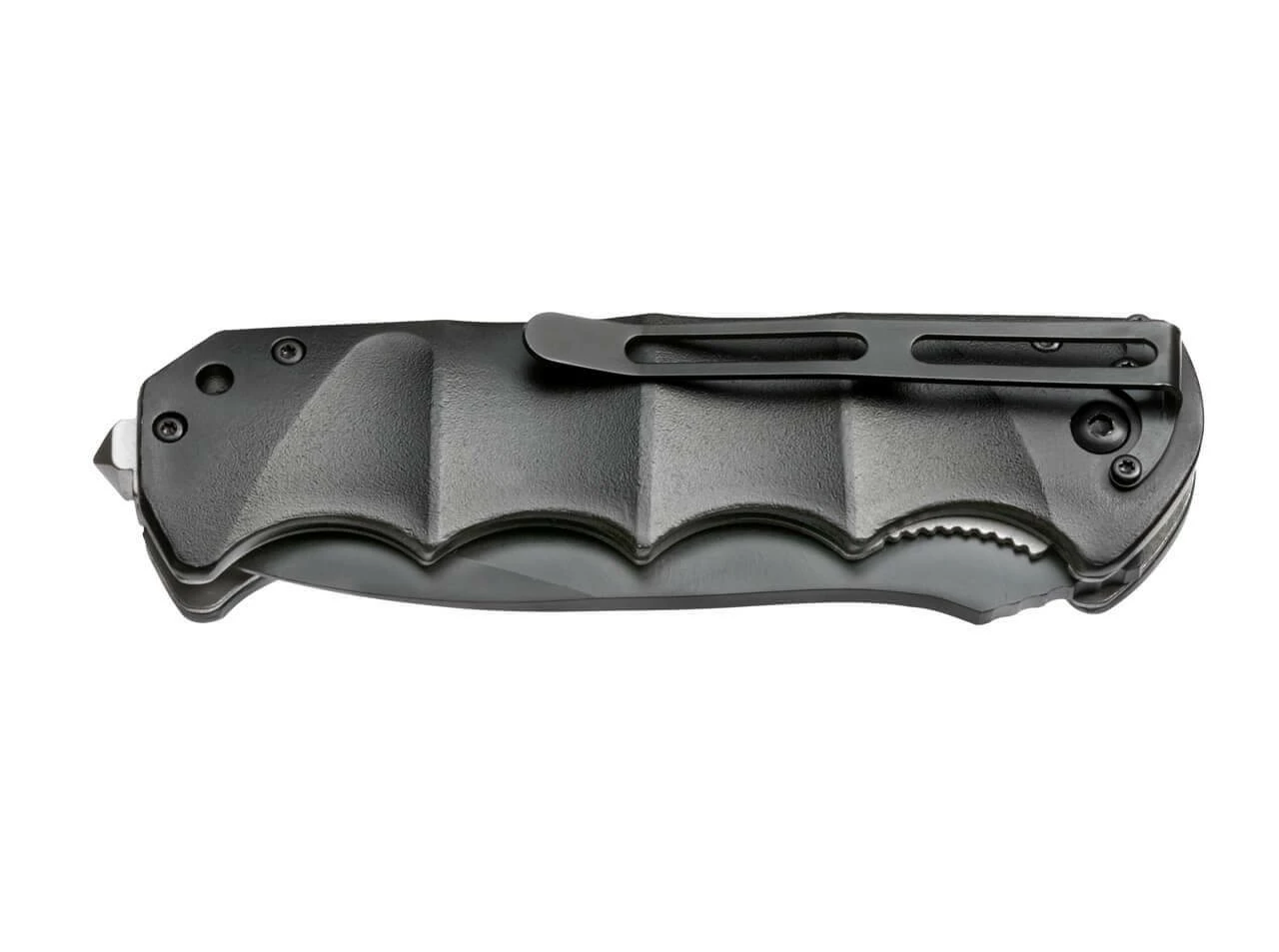 Das Magnum Black Spear II ist ein beeindruckendes Einsatzmesser, das vor keiner Mission zurückschreckt. Die modifizierte Spearpointklinge aus 440A weist einen leichten Recurveschwung auf. Durch diesen besitzt die Schneide nur vergleichsweise wenige Berührungspunkte mit dem Schnittgut. Das hat zur Folge, dass der an den Berührungspunkten ausgeübte Druck höher ist. Der Linerlock sorgt für die notwendige Sicherheit und dank des Nagelhaus lässt sich das Taschenmesser leicht öffnen und schließen. Durch die ausgeprägten Fingerrillen des schwarzen Aluminium-Griffes ist stets eine hohe Arbeitssicherheit bei allen Schneidarbeiten gegeben. Aluminium ist ein relativ weiches und zähes Metall, es ist sehr leicht und hat gleichzeitig eine hohe Festigkeit. Das Leichtmetall ist außerdem recyclingfähig. Mit Glasbrecher, Fangriemenöse und Hosenclip.