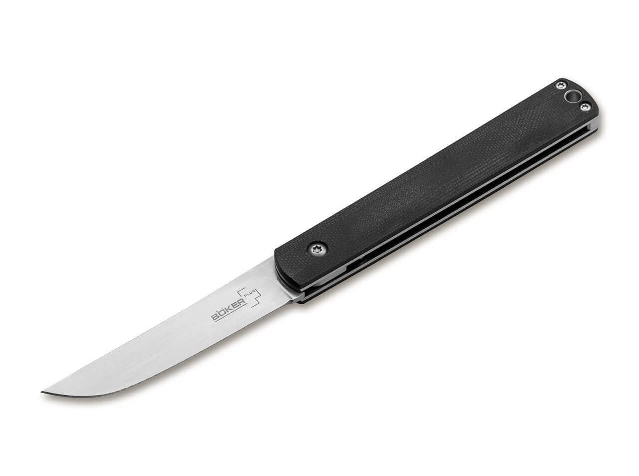 Die schlanke Bauweise und die leichtgewichtige Konstruktion des Böker Plus Wasabi ergeben zusammen mit dem geradlinigen Design und der klassisch-japanischen Klinge ein elegantes Messer für den Alltag. Die kugelgelagerte Klinge öffnet per Frontflipper und wird als Slipjoint von einem eigenen Detent Ball offengehalten. Für die Klinge kommt der bewährte 440C zum Einsatz. Griff mit Edelstahlplatinen und Beschalung aus schwarzem G10. Mit gefrästem Clip und hochwertigem Nylon-Etui zur Aufbewahrung.
