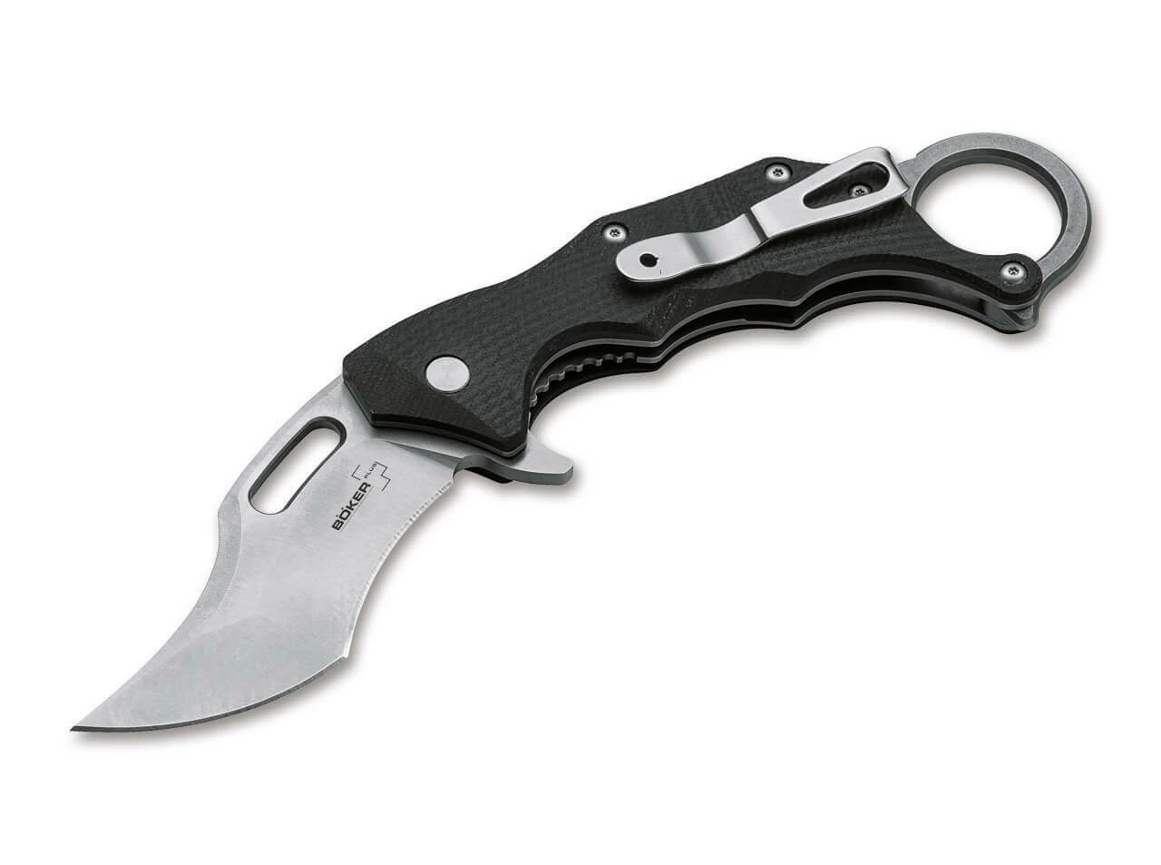 Die Entwürfe von Boris Manasherov überzeugen durchgehend durch ihre hohe Durchdachtheit, die perfekte Ergonomie und das ausdrucksstarke Design. Das überaus erfolgreiche Böker Plus Wildcat bekommt mit dem Wildcat XL einen großen Bruder zur Seite gestellt, der mit den gleichen Vorzügen punktet wie das Original, aber mit noch etwas mehr Handfestigkeit überzeugt. Für die kugelgelagerte Klinge kommt auch hier D2 zum Einsatz, während die Beschalung aus G10 besteht. Die Verriegelung erfolgt per Linerlock. Das Kerambit überzeugt mit perfekter Handlage, und die Klinge öffnet wahlweise weich per Daumenloch, oder schnell und nachdrücklich per Flipper. Der umsetzbare Clip (l/r) sorgt für einen tiefen Sitz in der Tasche, der den Ring jedoch oberhalb des Taschensaumes für ein schnelles Ziehen zugänglich lässt.